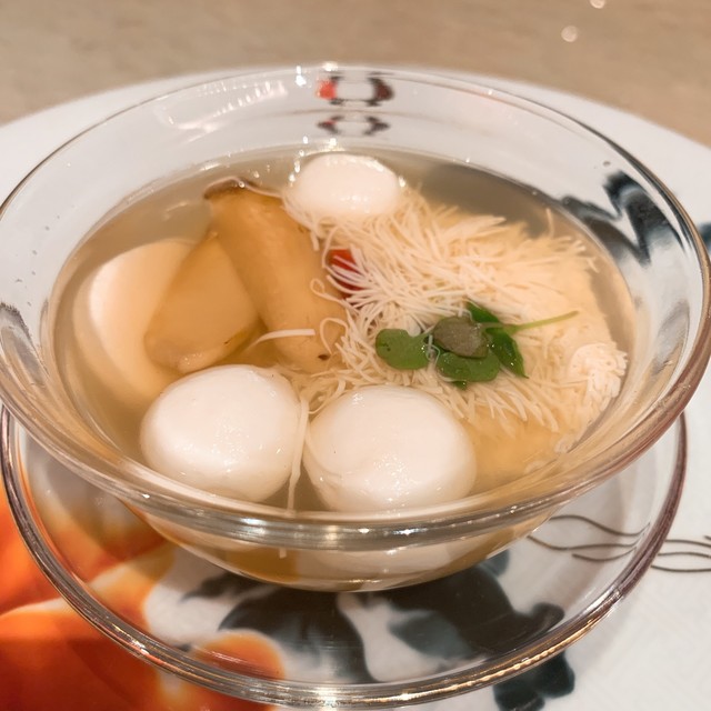 ④松茸、菊花型豆腐、フィッシュボール入り繊細なチキンスープ 160MOP≒2240円