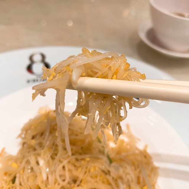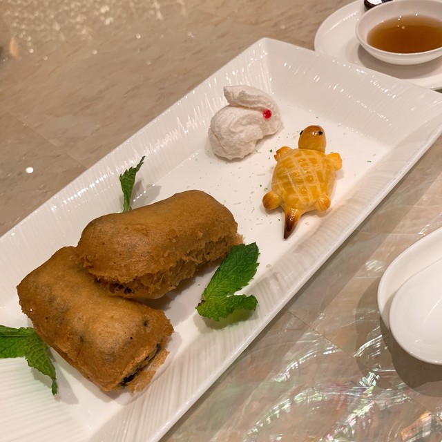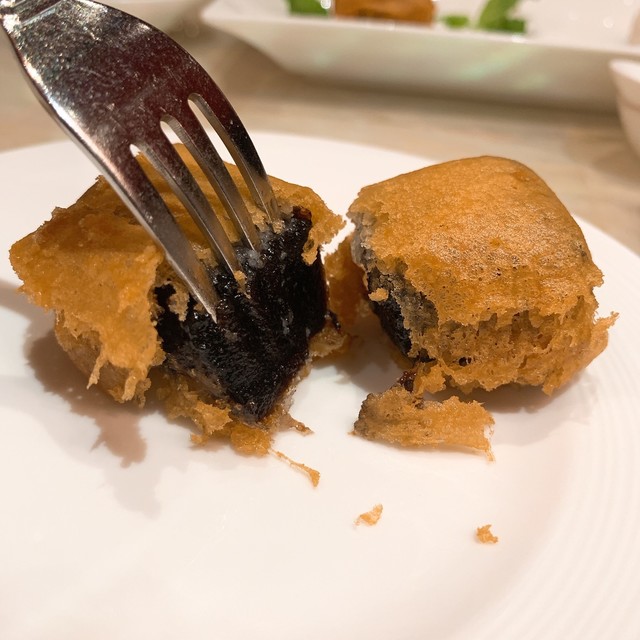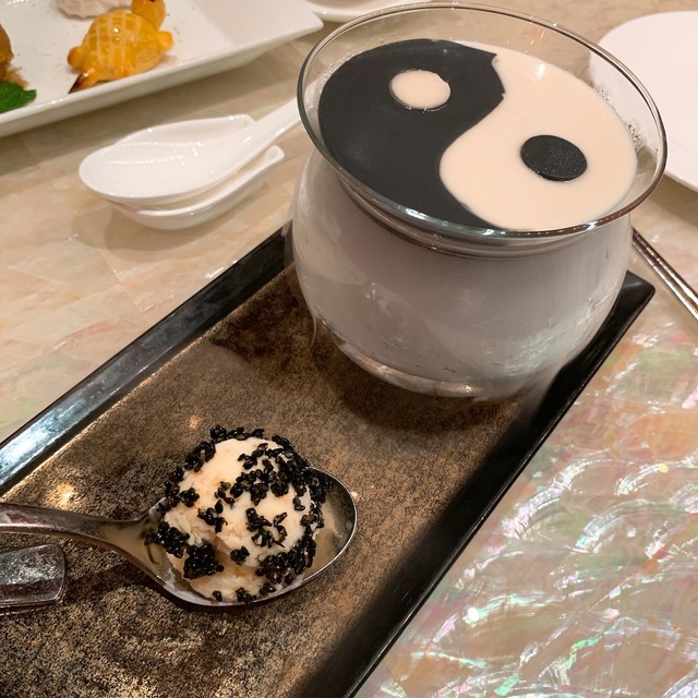 フォアグラ、バーベキューポーク、中華ソーセージは小さいながらも畳みかける3種のグレイビーが凝縮された旨みを醸し出しています。これは美味い♪ 幸先良いですねぇ。クラゲの頭はブルブルシャキシャキの歯ごたえにビンテージ黒酢のただ単なる酸味と言う表現だけでは片づけられないような、深いコクを感じます。繊細なチキンスープは確かに繊細を謳うだけあって、アクやエグミを丁寧に取り去った気品の漂うチキンスープに、松茸の香りが加わり、菊花型豆腐のピロッピロした柔らかで独特な食感が見事。アワビとアヒルは風味豊かで濃厚な味付けと、かなり柔らかくなるまで煮込んだ完品。大バイ貝はチーズはパン粉等を使用しているので中華とは言い難いですが、これまた美味しい。そして本日のNo.1はカニ肉と干し貝柱の細麵ヤキソバ。細麺のバミセリと極細の春雨?の二種類を合わせている様です。それぞれ異なる時間火を通さないとこの様にどちらもベストな食感とはならないでしょう。そしてたっぷりの蟹肉と干し貝柱も麺の細さに合わせてほぐしてあり、自然で強い旨みが出ています。更にその強すぎる旨みを散りばめられた少量の卵で緩和させており、白髪ねぎで食感と香りを加えるという、とことん考えつくされたヤキソバ。今まで食べたヤキソバの中で一番美味しいといっても過言ではありません。デザートの方は美しい黒白で彩られたプリンは黒白胡麻を使っており、胡麻の香りが凄い。過去に食べた亀ゼリーは苦い・美味しくないと言う印象しかなかったのですが、こちらは繊細な薄衣でサックリ揚げてあり、深みのある甘味を感じるハチミツの様なソースで漬けて食べると、苦みが心地よいという感覚に変わるのでした。全体的には中華の伝統を重んじるメニューが多いながらも少しアレンジ・挑戦メニューを取り入れている感じですね。とにかく私にはツボにハマりました。他にも沢山メニューがありますので、次回マカオに来た時にはぜひとも他の料理も試したいと思わせる良店でありました。