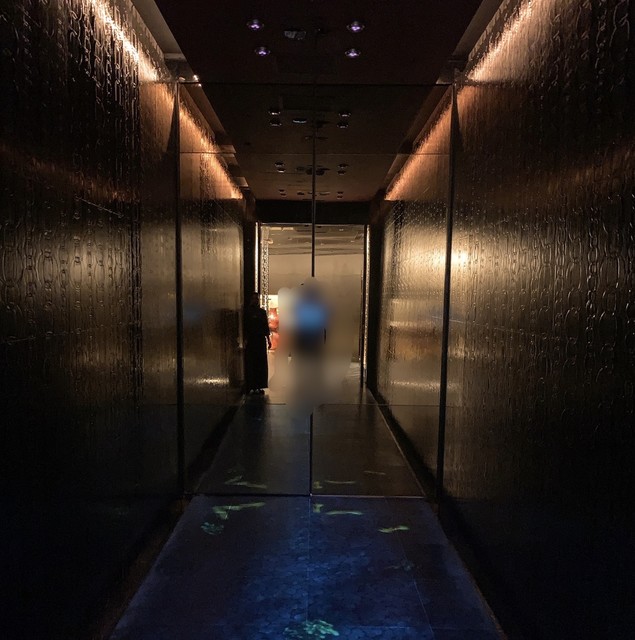 受付けの女性にいざなわれて、ドアを開けるとまず鏡に覆われた暗い通路にプロジェクションマッピングで私の動きに魚が反応して泳ぐと言うイリュージョン。