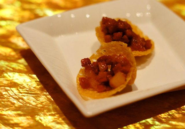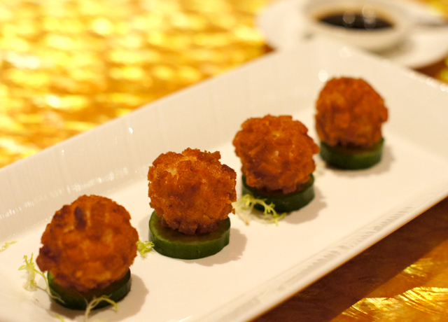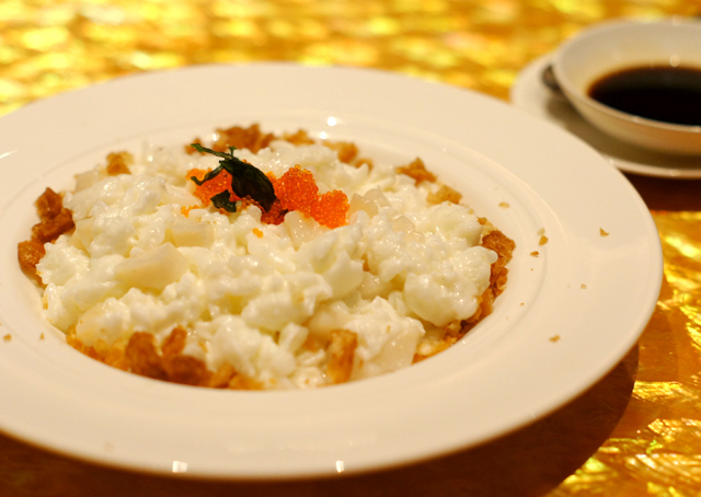 面白そうな料理があったのでオーダー。カリッとした海老団子の中に、フォアグラを詰めたもの。いつもフォアグラのコンフィとかが多いので、濃厚なものを想像していたのですが、思いの外あっさり。