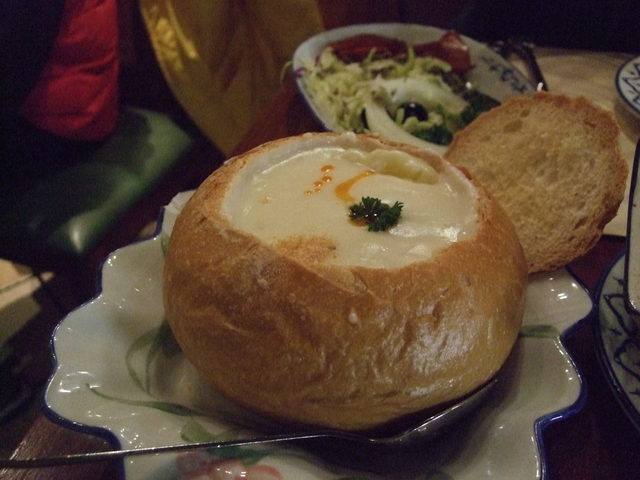 白身魚とポテト入りのパンに入ったシチュー