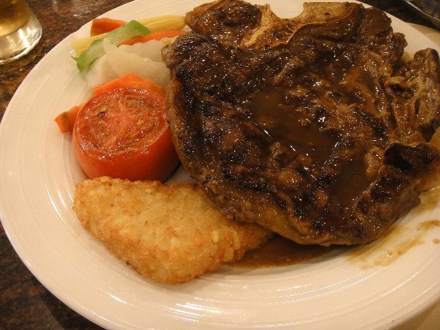 スパイスの効いた鴨肉やエビの創作料理、それに大きなステーキなど。
