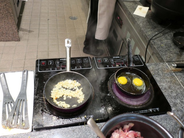 2種類の麺が用意された拉麺に、やはり固くなるまで火を通すオムレツ、