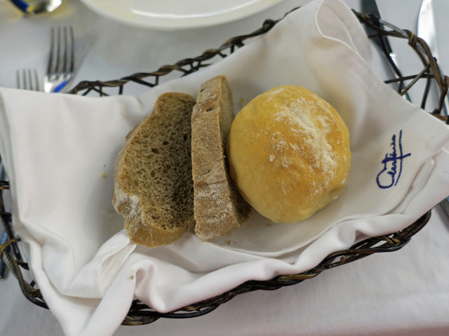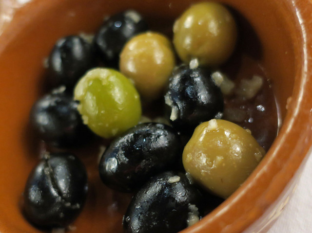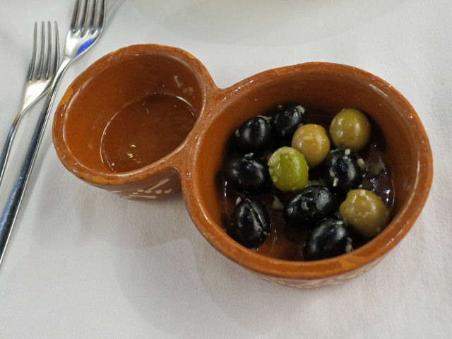 温かいパン、それに黒・緑のオリーブが提供された。