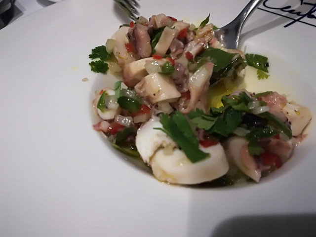 タコのサラダコリアンダーが入っていて味はおいしくてドレッシングはパンにつけておいしくいただきました♡♡♡