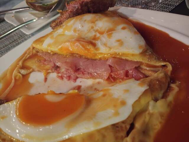 フランセジーニャというハムとチーズとハムなどがはさんだサンドイッチ、そしてチーズが豪快にのったパイみたいな食べ物で、ポルトガルではかなりポピュラーな料理なんだそうな。これはとても美味しかった、今日イチだったな!
