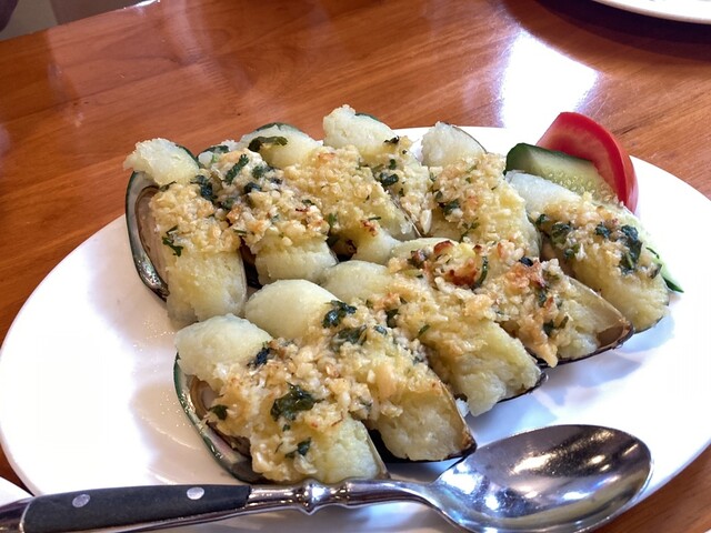 続いて定番の「鱈のすり身のコロッケ」。ほんのり塩味が効いて美味。他には、「豚肉のグリル」、「ムール貝のガーリック焼き」「アサリのバター炒め」。いずれも、ガーリックがたんまり効いていてパンチのある味。ビールが欠かせません。
