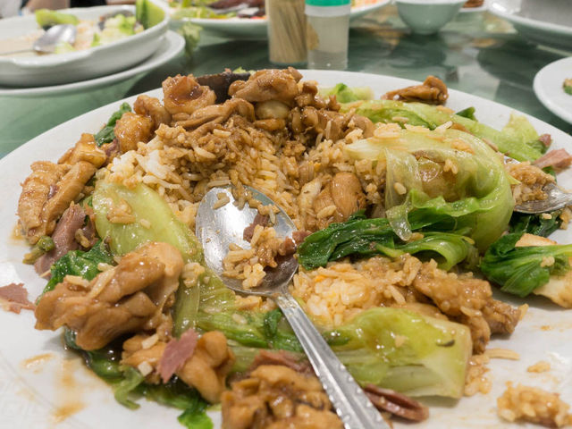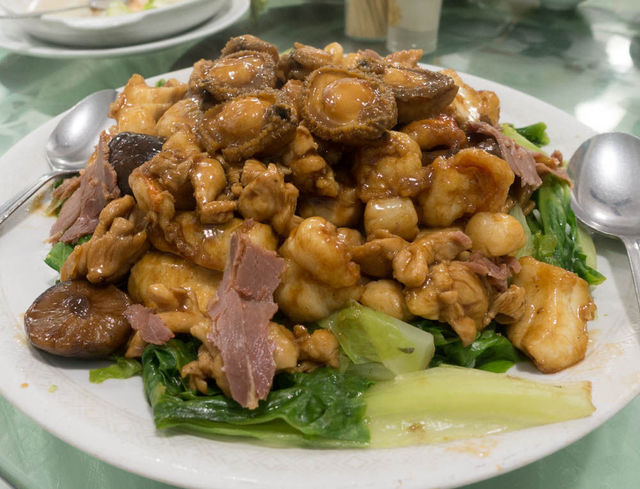 鮑、スズキ、オイスター、具の味、イートン、砂糖少し、中華ハム、塩、化学も、スズキ、鶏もあり盛りだくさん。下はシンプルな蟹風味の炒飯。破壊力のある料理だ。