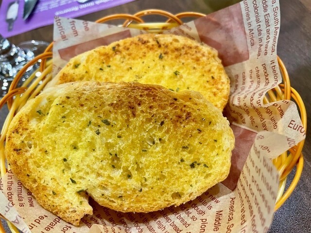 お通しのガーリックトースト。ニンニクたっぷりで美味しい!