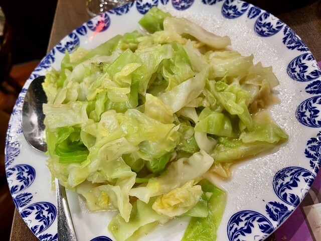 何かのお出汁で煮込んだキャベツの煮物。お出汁は海鮮とは違うし、何だろう。