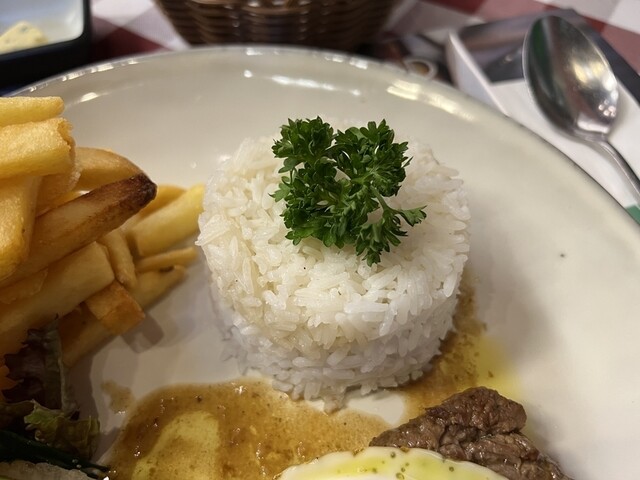 ステーキとジャスミンライスってこんなにも合うのね!日本でもステーキに付いてくるライスをジャスミンライスに置き換えちゃってもいいくらいよ!