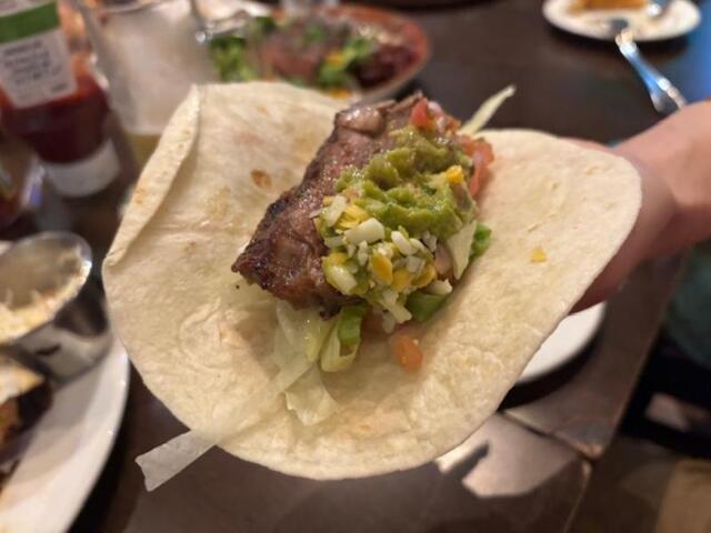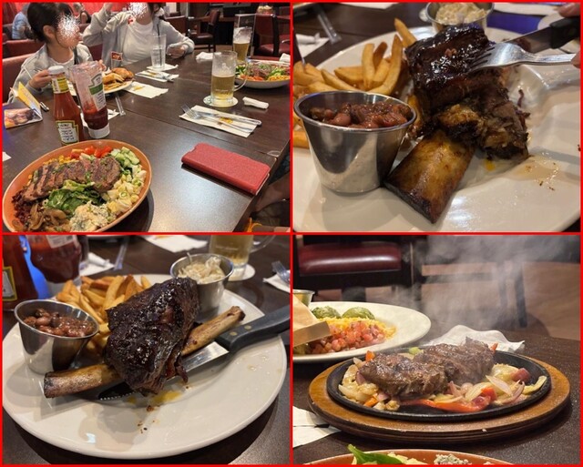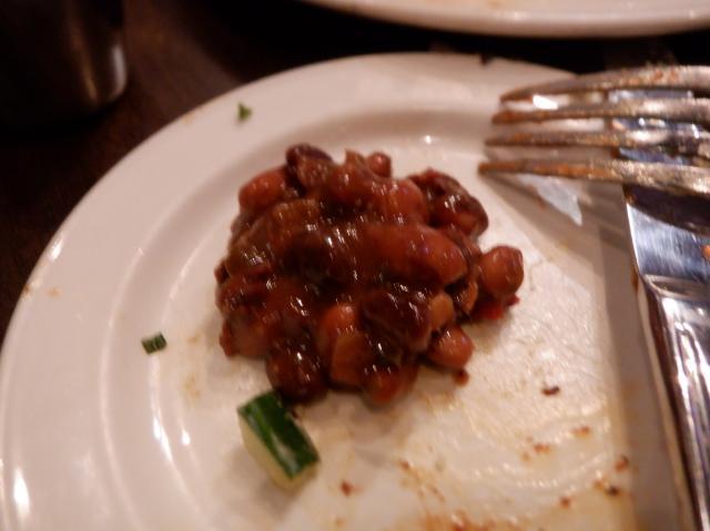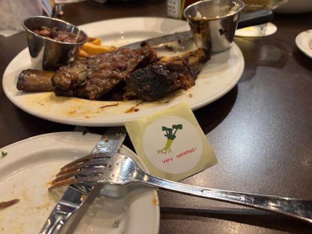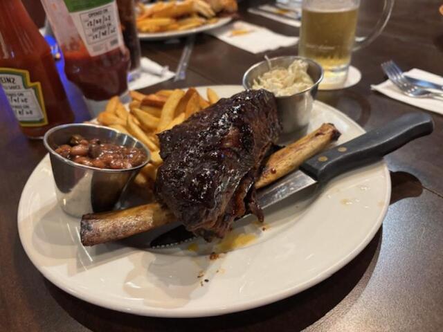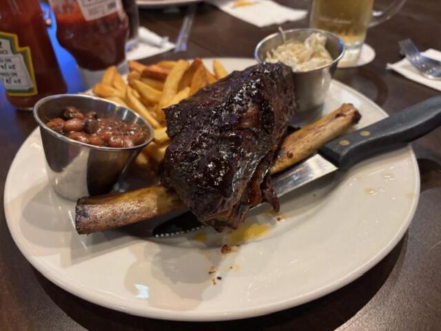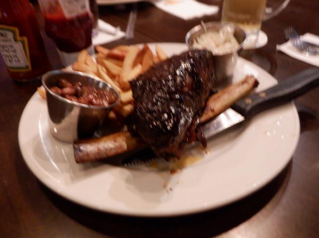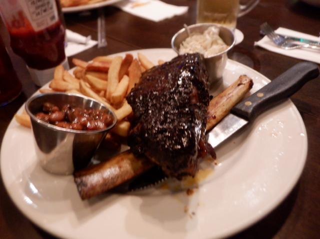 バーベキューリブ、じっくり火入れされていて柔らかでサイドにキドニービーンとザワークラフト、カントリーフライドポテト、かなりのボリューム感