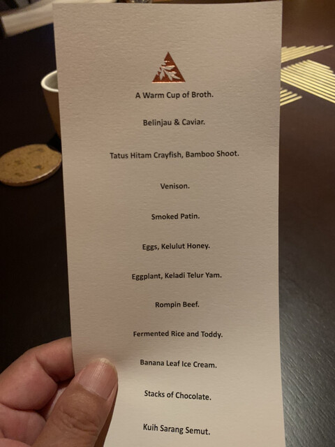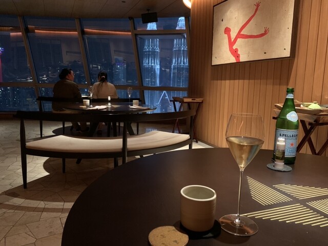 市内中心部、嫌いな超高層レストラン48階ですが、アジアTOP50かつ星付、国内No.1レストラン、てなことで来店です。人気店ゆえか1人予約だと強制2巡目21時スタート、でも平日金曜、満席にはなっていません。最初にキッチンで、コンセプトの説明、お料理地産地消、パクチーダメな人はダメかもですね\(//∇//)\ マレー半島東部の牛もライスも日本産並にうんまいです、BGMは現地オールディーズ?暗めの昭和歌謡みたいでいいです、コースは150分かかるとありましたが、速く食べれば速く出て80分で終了(๑˃̵ᴗ˂̵)