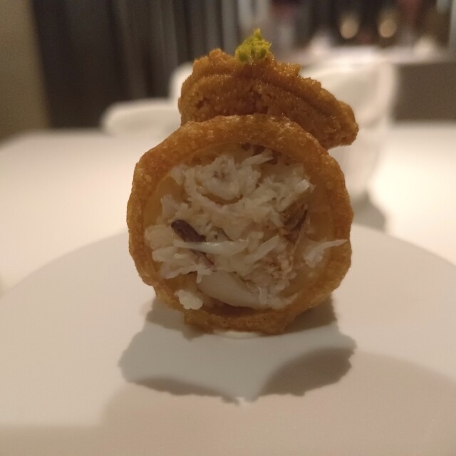 左上は蟹身を包んだパイに海胆を乗せたもの。海胆はあまり存在感を発揮しませんが蟹パイがとても美味しい。