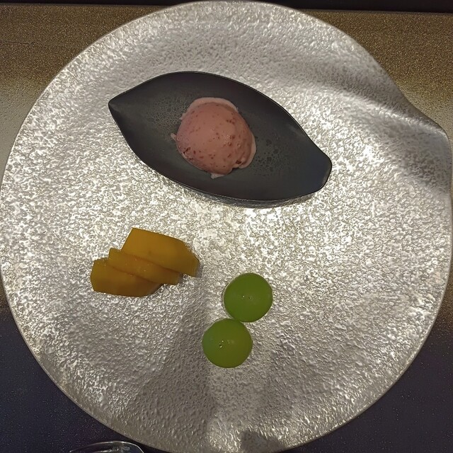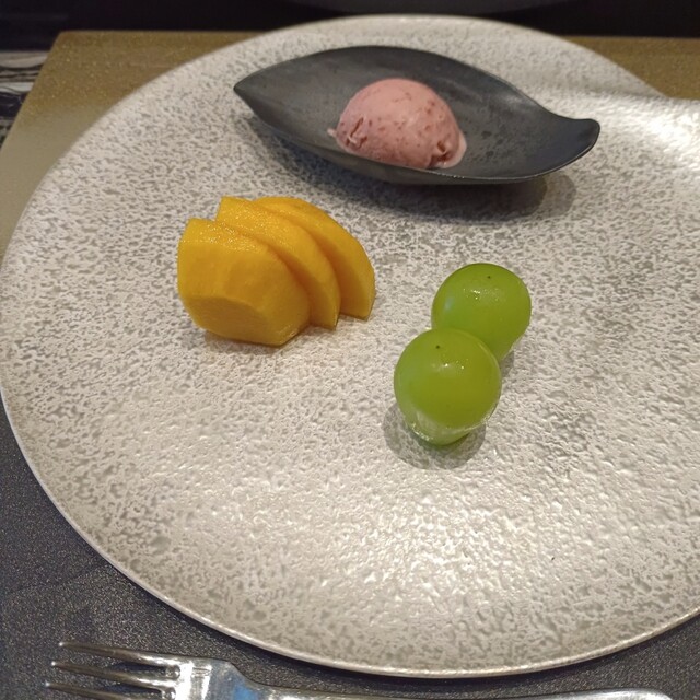 デザートはシャインマスカット、柿、ストロベリーシャーベット。
