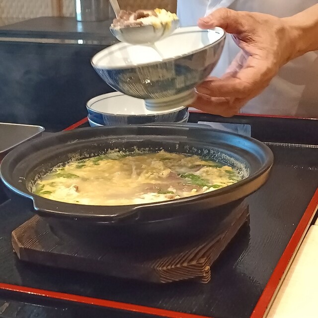 目の前でよそわれるのは毛蟹と牛肉の雑炊。