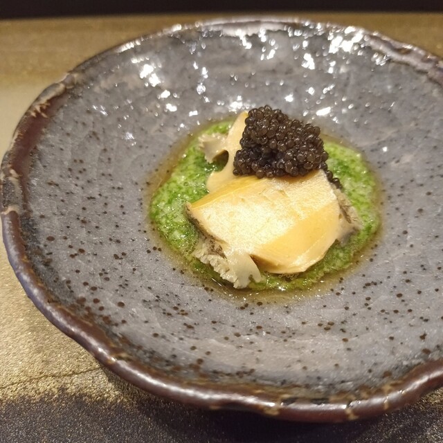 といいつつ一品目は蒸し鮑とキャビアの酢の物。