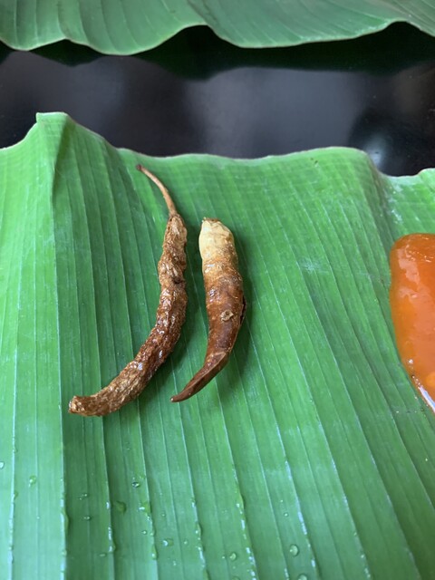 その上に店員さんが各席を回り、素揚げした唐辛子とチャツネをのせていきます。