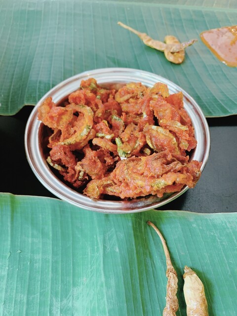 別皿で真っ赤なゴーヤのフライ、パリパリッとした円盤形のパパダムも提供。
