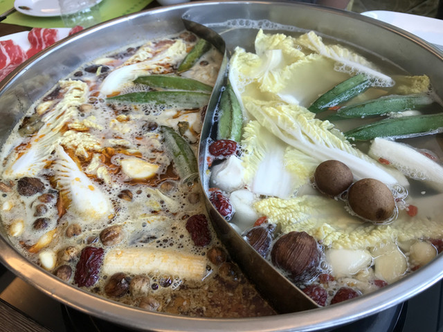 メニューはシンプルで、ずばり火鍋なのですが、3つ選べるスープのうち一つが定番?らしく薬膳系のお味であっさりしつつも出汁が聞いている感じがして、一度食べるとそのうちまた食べたくなる味です。具材はどのこの火鍋屋にもあるようなものですが、定番なので安心できるという感じでしょうか。