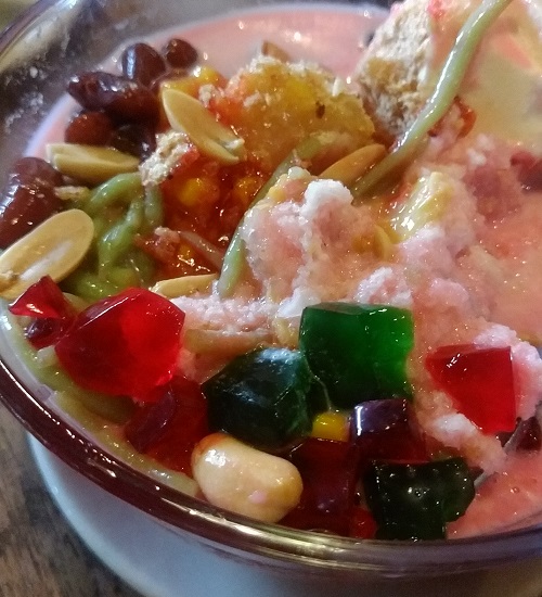 こちらではチェンドルに使われる緑色のゼリーも入っています。左手前の細長い形状のものがそうです。