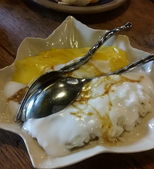 スライスしたマンゴーにごはんが添えられていてココナッツミルクがかかっています。