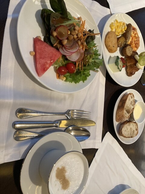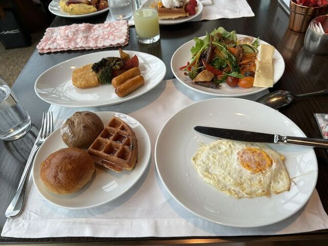 GrandHyatt38Fのレストラン。朝食ブッフェです。いろいな国の人で大賑わい。サラダが充実しています。麺の屋台もありますが朝からはちょっと重いかな。食べている人はたくさんいました。