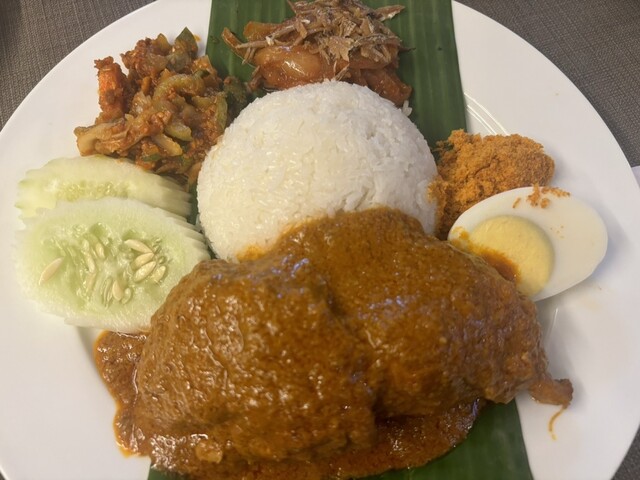 Steamed rice cooked in coconut milk, served with Curry Chicken, sambal ikan bilis (spicy anchovies), shrimp floss, hard boiled egg, Acar (Spicy pickled vegetables) and sliced cucumbers.