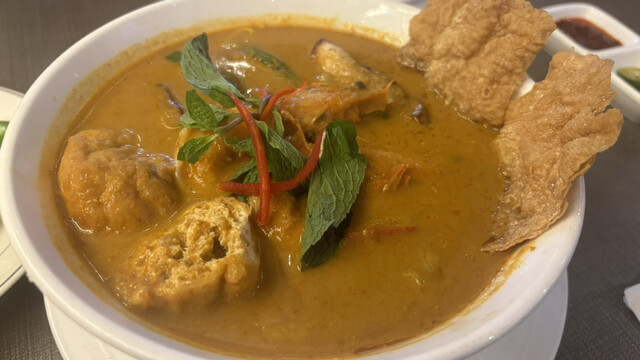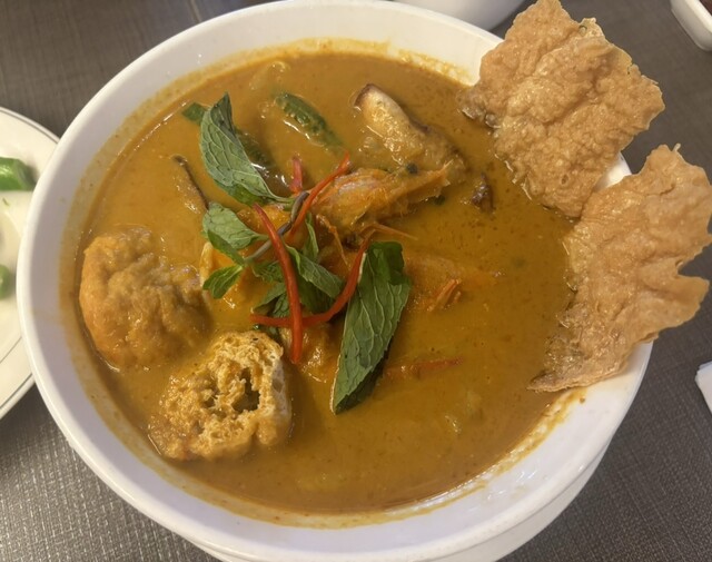 Yellow noodles in curry broth served with chicken slices, prawns, beansprouts, fried beancurd puff and fuzok.(YELLOW MEE)