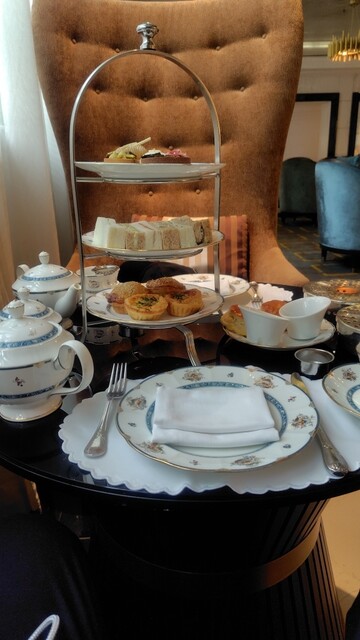 まず、席へ案内され、椅子の立派さに驚かされたあと、お茶たくさん置かれているところでお茶を選び、再度、席へ。しばらくすると、サンドウィッチやスコーン、ケースなどが運ばれてきました。