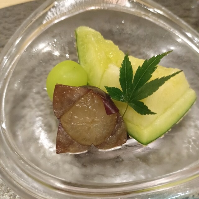 お口直しはマスクメロン、ピオーネ、シャインマスカットの間違いないフルーツ3種盛り。