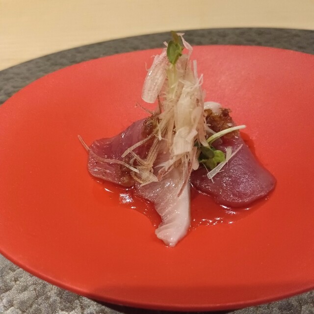 静岡の鰹にはたっぷりの茗荷とカイワレを添えて。