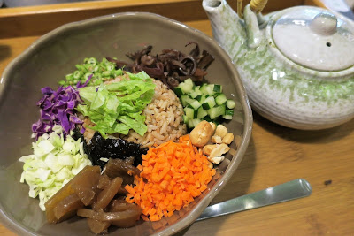 ごはんと8種類のトッピング=人参+キャベツ(緑と赤の2種類)+いんげん+きゅうり+きくらげ+カシューナッツ+大根漬物。