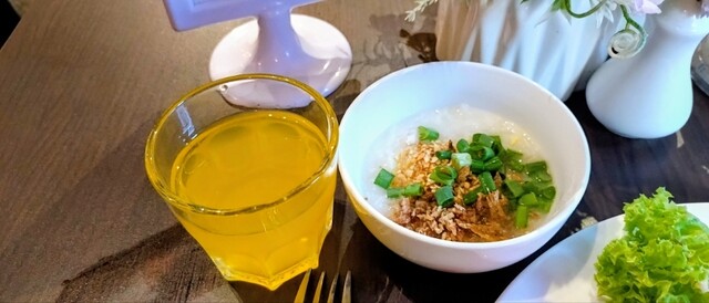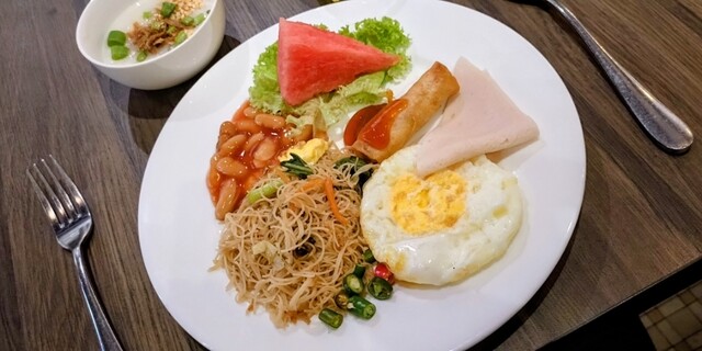 翌朝、レストランで迎えた朝食は、静けさと温かさを同時に感じさせるものだった。カリッと焼かれたバタートーストを噛むと、表面は香ばしく、内側はふわりと柔らかい。そこに濃厚なカヤジャムを塗れば、舌に広がる甘さとココナッツの香りが、どこか懐かしい心地を呼び覚ます。コーヒーの苦みとまろやかさが喉を通り抜け、体にゆっくりと熱を灯していく。ナシレマッのココナッツライスはふっくらとして指先にまで香りが届くようで、サンバルの辛さは舌先に火を点す。窓の外を見れば、通りを行き交う人々の声とバイクのエンジン音が重なり、朝の街はもう新しい一日を走り始めていた。