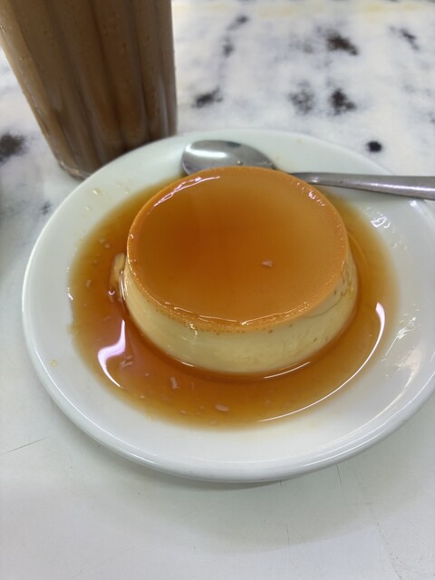 すぐそばでモヤシ炒めを食べた後にうかがいました。甘いホワイトコーヒーとエッグタルトがおいしかった。