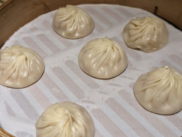 真打登場、小籠包です。美しく折られたヒダの数は18と規定されており、重さもピッタリ21グラムと厳格に定められています。スープや具が透けてみえるほど薄い手作りの皮はツルツルとした食感で口当たりが実に滑らか。10個入りで千円弱と、シンガポールの半額で、東京よりも3-4割は安い印象を受けました。