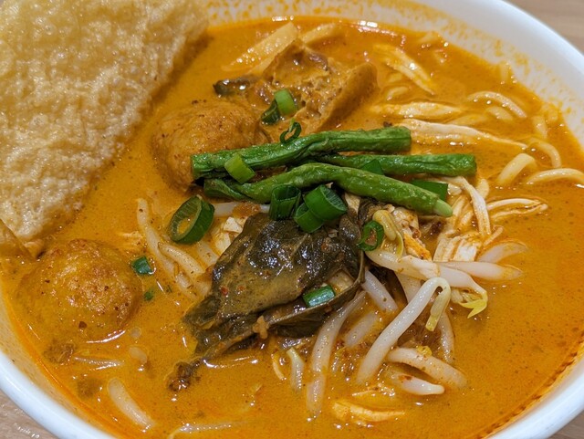 ラクサ。マレーシアを代表する麺料理であり、日本のラーメンのようにバリエーションが豊かです。当店のそれはカレー風味が強くクリーミーな口当たり。それでも辛味は暴力的であり、辛味に強い連れも完飲は断念していました。