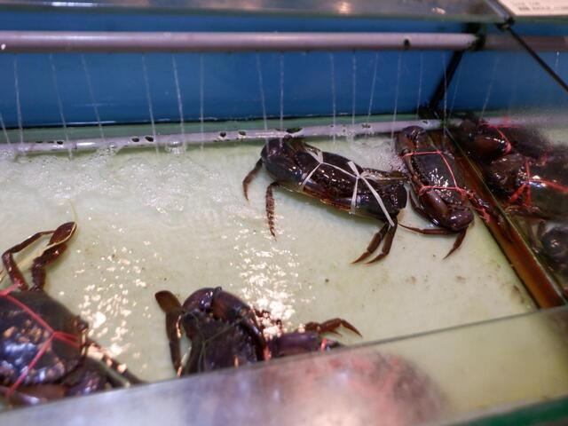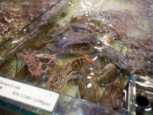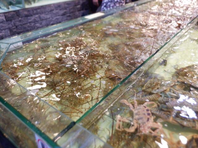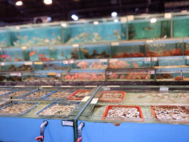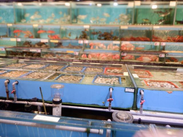 香港によくある大型水槽が沢山並んでいて海産物、活の物が置かれています。