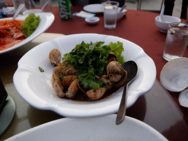 日本のあさりに似た貝を豆豉(トウチ)ソース炒めでたっぷり香菜(コリアンダー)トッピングで・・