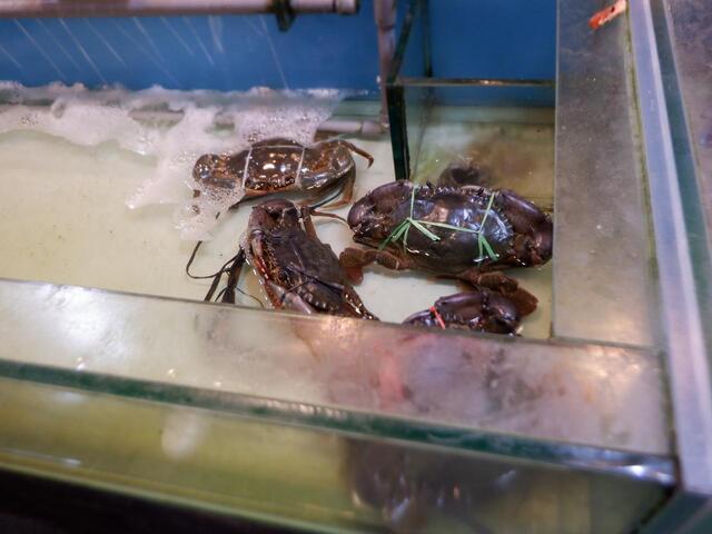 先ずはその水槽を拝見・・蟹も何種か・・魚、貝類とかなり豊富に、ロブスターも各サイズの物・・
