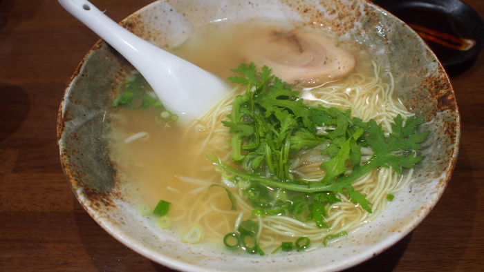「揚子江ラーメン」(680円)は、独特の底の浅い器に揚子江らしい実に美しい半透明のスープに麺が横たわり、特徴的な菊菜が器を鮮やかにしています。立ち上る菊菜の香りがいいですね。