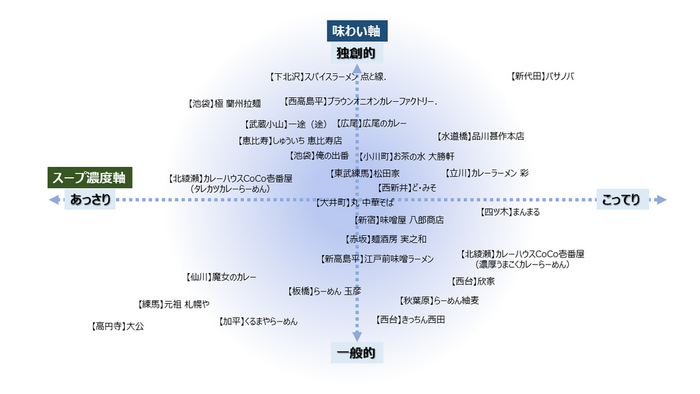 『カレーラーメン』はスープの濃度で「あっさり」と「こってり(ドロドロ)」その中間等いろいろあります。これもかなりお好みがあり、甲乙つけがたい状況です。スープの濃度(あっさり⇔こってり)を横軸に、「独創的な味わい」=オリジナル or チャレンジ系、「一般的な味わい」=保守系を縦軸に、して以下の図のように勝手に分類してみました。