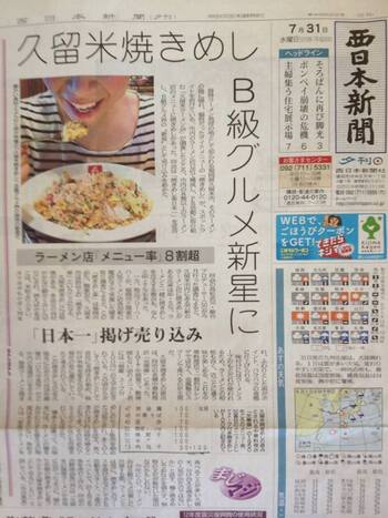 久留米の焼きめしは、昔からわたしたち久留米市民にとっては馴染み深いものでしたが、雑誌で特集されたことや、昨年なんと!西日本新聞の夕刊一面TOP記事に掲載されたことから全国的に注目され、テレビ・ラジオなどのメディアも大注目で人気沸騰中! “ラーメンと焼きめし”を求めて、県外から訪れるお客さんも大勢いるほど有名になっています。「えっ!?焼きめし?そんな普通なのが有名なの!?」と思われるかも知れませんが、実は、 久留米焼きめしには、数字的にも全国で珍しい秘密が隠されていたのです。