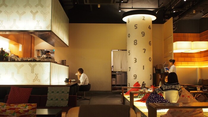 店内は、広いスペースの真ん中にはなんとお座敷。その座敷には妙な形と色彩をもつ座椅子が並び、その周りはゆったりと配されたテーブル席とソファ席。そしてカウンター席の横には「大黒柱」がそびえています。席数は全部で65席とのこと。