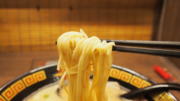麺は博多発祥のラーメンらしい極細のストレート麺で、適度なコシを持ちつつ歯切れのいい仕上がりです。スープがサラッとしている分、絡みは弱いですね。