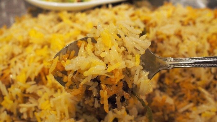 「ビリヤニ」とはナツメグ、クミン、コショウ、クローブ、カルダモン 等の多数のスパイスをギーと共に炊き込んだご飯。斑に炊き上がったのを敢えて混ぜずに彩を見せています。