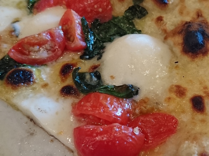 『マルゲリータ』は推定直径28㎝でそこそこの大きさ。モッツアレラは細かいタイプでコルニチョーネは適度な隆起と焦げ目。でも残念ながらバジルの量がしょぼいです。