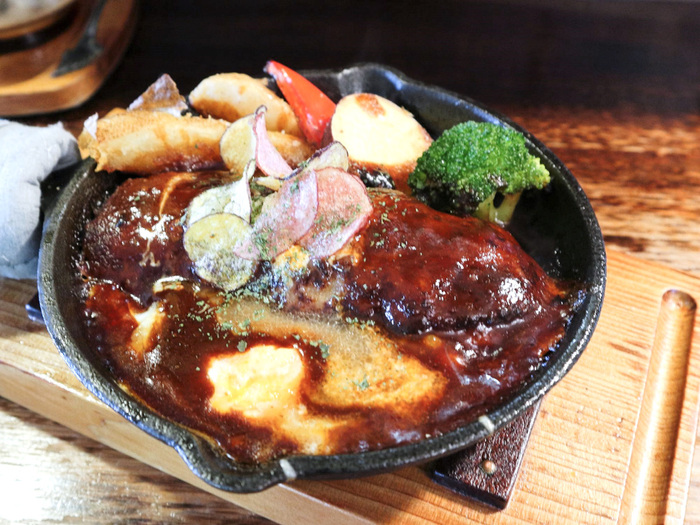 窯焼き…要はオーブンだと思いますが、それでしか仕上げられないと思える楕円形で厚みのあるハンバーグで、外側はいい感じの硬さで、内側はいい感じの柔らかさがありました。切ると肉汁が出てきて、見た目にも食欲が湧きました。ソース的なものはあるようなないような…肉の…ハンバーグの美味しさと言うのか、肉汁の味なのか、少し甘さも感じる味わいがご飯をすすむ君にさせました。添え野菜も美味しく食べれました。特に玉ねぎが美味しいと思いました。ご飯は好みの炊き加減で美味しく、スープは味が少し薄味に感じましたが具沢山でした。サラダは量が多めで、肉々しいWハンバーグの箸休めになりました。