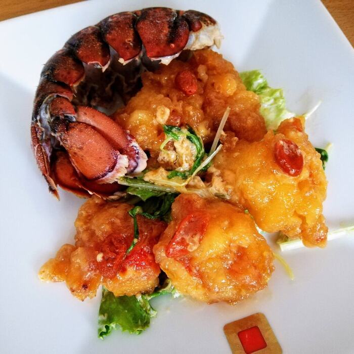 見出しのオマール海老の雲丹マヨ和えなど、海鮮を広東料理の技法で仕上げる。