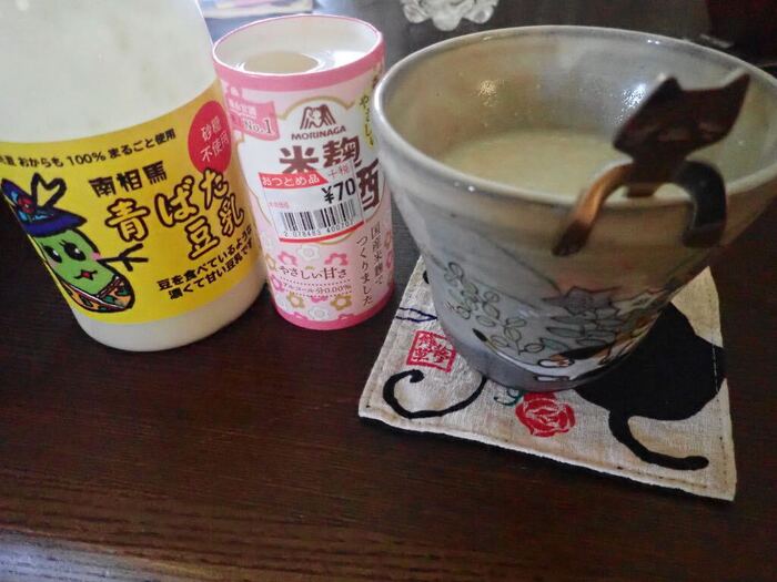 お店のご近所にある、きぼうのあさがおさんでつくってる 青ばた豆乳。